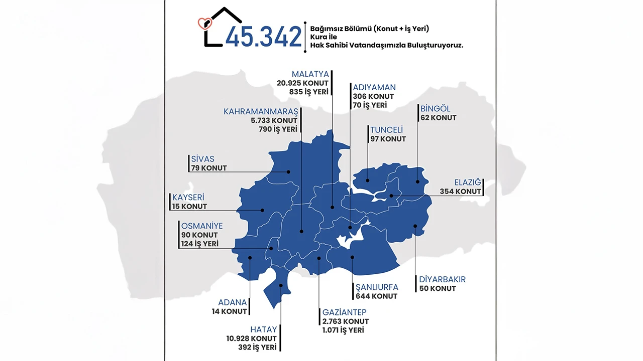 - Kahramanmaraş’ta 5.733 konut ve 790 iş yeri, Şanlıurfa’da ise 644 konut hak sahiplerine verildi.