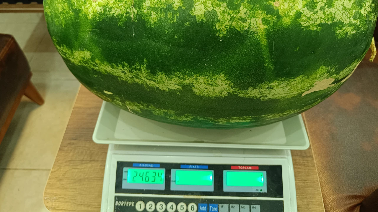 Terazide tartılan karpuzlardan birinin ağırlığı 24 kilo 634 gram geldi.