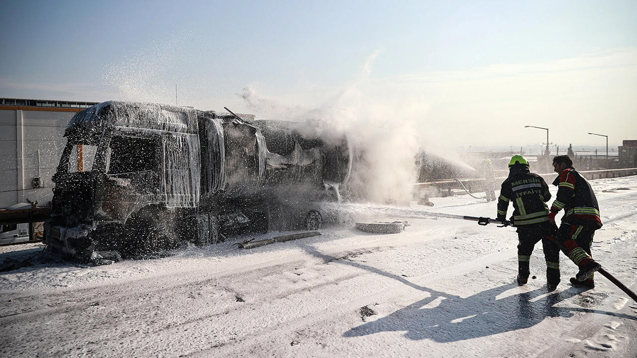 Ebubekir Güven idaresindeki 26 VF 647 plakalı akaryakıt yüklü tanker, Mersin-Adana Otoyolu, Mersin Serbest Bölgesi bağlantı yolunda alev aldı.