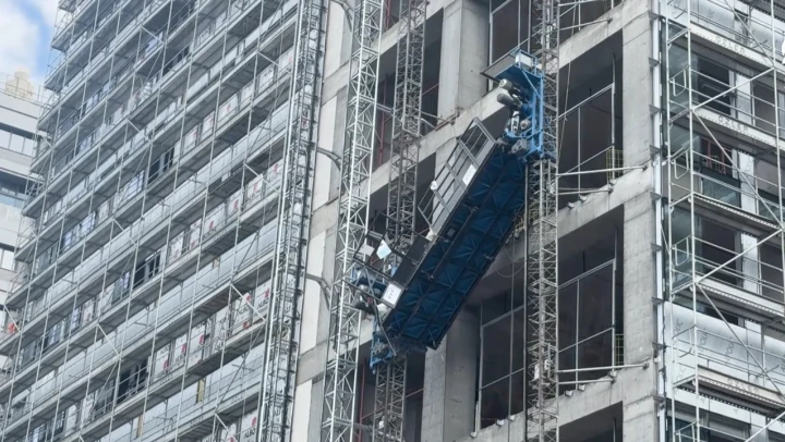 Yenibosna'da plaza inşaatının dış cephesindeki açık asansör, arıza nedeniyle üzerindeki 4 işçiyle birlikte bir tarafı sarkarak asılı kaldı.