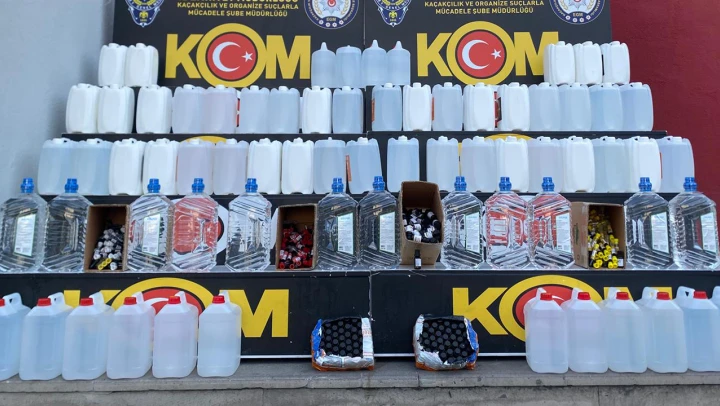Adreslerde yapılan aramalarda 800 litre kaçak etil alkol ile 580 aroma kiti ele geçirildi.