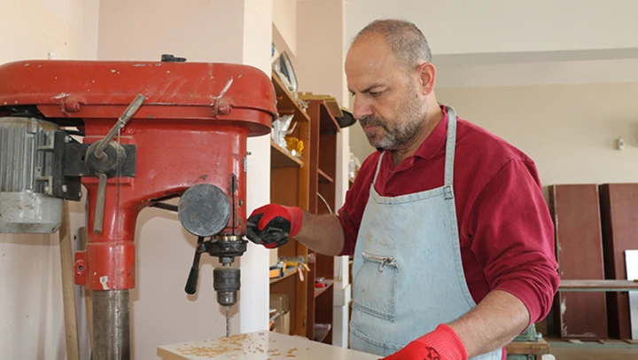 Adana'da mobilya üretiminde kendisini geliştiren 53 yaşındaki Şehmus Yaman, müdürlüğünü yaptığı Şakirpaşa Mesleki ve Teknik Anadolu Lisesi'nde kullanılan materyalleri el emeğiyle tasarlıyor.