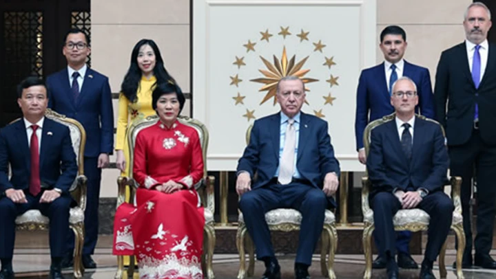 Cumhurbaşkanı Recep Tayyip Erdoğan, Vietnam Büyükelçisi Dang Thi Thu Ha'yı Cumhurbaşkanlığı Külliyesinde kabul etti. Kabulde Büyükelçi Dang Thi Thu Ha, Cumhurbaşkanı Erdoğan'a güven mektubunu sundu.