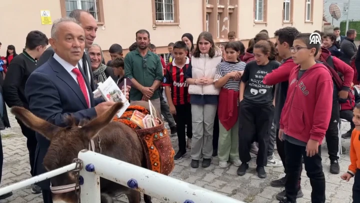 Ardahan'ın Gürcistan sınırındaki Posof ilçesindeki, Posof İlkokulu'na eşekle gelen gurbetçi 60 yaşındaki Bilge, hayvanın heybesindeki Türk ve dünya klasikleriyle kırtasiye malzemelerini öğrencilere hediye etti.