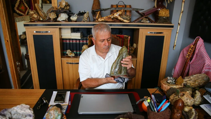 Mersin'de 60 yaşındaki doğa tutkunu Hüseyin Durer, farklı bölgelerde gerçekleştirdiği tırmanışlarda topladığı çeşitli türlerden 2 bin taşı ofisinde sergiliyor.