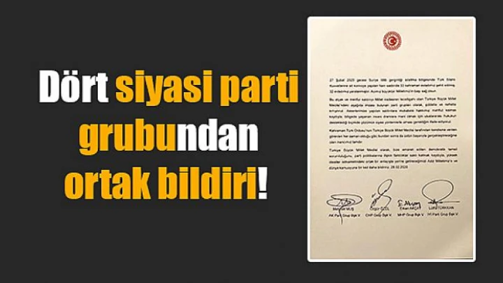 İdlib'te askerlerimize yönelik yapılan hain saldırıya ilişkin Türkiye Büyük Millet Meclisi (TBMM)'de grubu bulunan 4 siyasi parti ortak bildiri yayımladı.