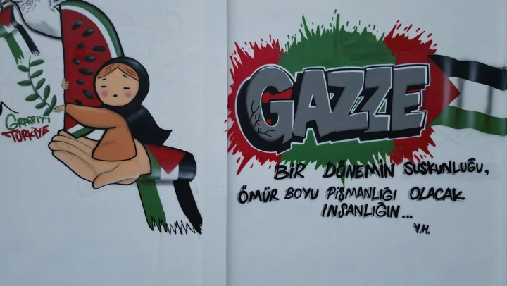 Kahramanmaraş'ın Onikişubat ilçesinde gri trafolar, Filistin'de yaşanan insanlık dramına karşı vicdanın tuvaline dönüştü. Onikişubat Belediyesi'nin davetiyle şehre gelen ünlü grafiti sanatçısı Vehbi Atakan Acar, sprey boyalarıyla Gazze'nin sessiz çığlığını kentin en işlek noktalarına taşıdı. Ortaya çıkan eserler, görenleri hem sanatsal derinliğiyle etkiliyor hem de yaşanan zulme karşı güçlü bir duruş sergiliyor.