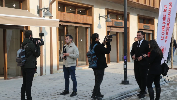 Çevre, Şehircilik ve İklim Değişikliği Bakanlığı koordinasyonundaki etkinliğe katılan basın mensupları, restorasyon çalışmalarının sürdüğü tarihi Uzun Çarşı'yı gezdi.