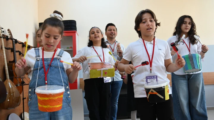 Müzik öğretmeni Hasan Hüseyin Topak'ın idaresinde orkestra kuran öğrenciler, hem hazırladıkları enstrümanları kullanıyor hem de şarkı söylüyor.