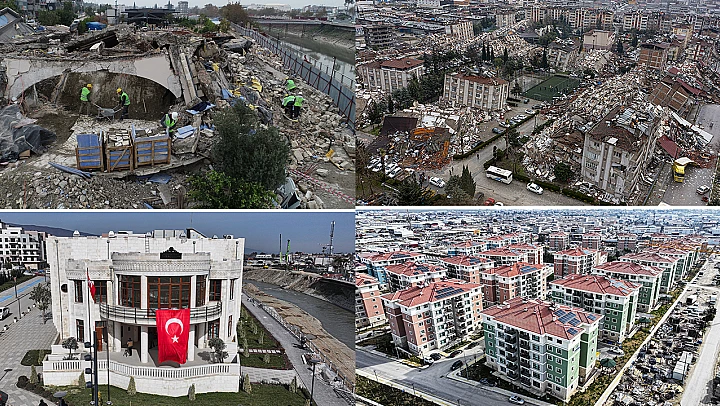 Hatay'da 6 Şubat 2023'te meydana gelen depremlerdeki yıkımın fotoğraf ve videoları ile afetin üçüncü yılında aynı açıyla havadan kayda alınan görsellerin birleşimi, şehirde inşa çalışmalarında gelinen noktayı ortaya koydu.