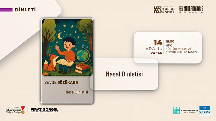 Bu kapsamda, 14 Aralık Pazar günü çocuklar için özel bir masal dinletisi programı düzenlenecek. Necip Fazıl Kısakürek Kültür Merkezi Çocuk Kütüphanesi'nde gerçekleştirilecek etkinlikte, çocuk edebiyatının sevilen isimlerinden Sevde Gözükara, minik okurlarla bir araya gelecek. Saat 16.00'da başlayacak programda Gözükara, birbirinden eğlenceli, öğretici ve hayal gücünü besleyen masalları çocuklarla paylaşacak.