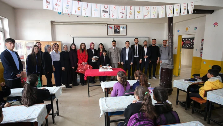 Sınıfta şarkılar eşliğinde hazırladıkları pastayı kesen öğretmen ve öğrenciler, yanlarında götürdükleri hediyeleri takdim ederek unutamayacakları anlar yaşattı.