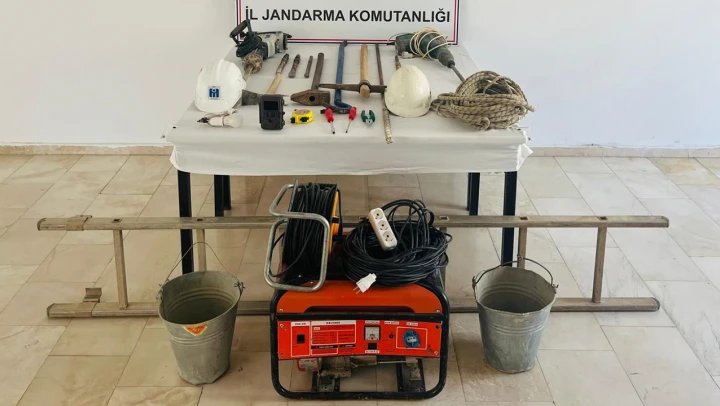 Aramada, jeneratör, 2 delici alet, fotokapan, 2 baret, çapa, balyoz, kazma, 5 metre seyyar lamba, 20 metre ip, 50 metre seyyar elektrik kablosu, 7 delici makine ucu, pense, tornavida, merdiven ve 2 kova bulundu.