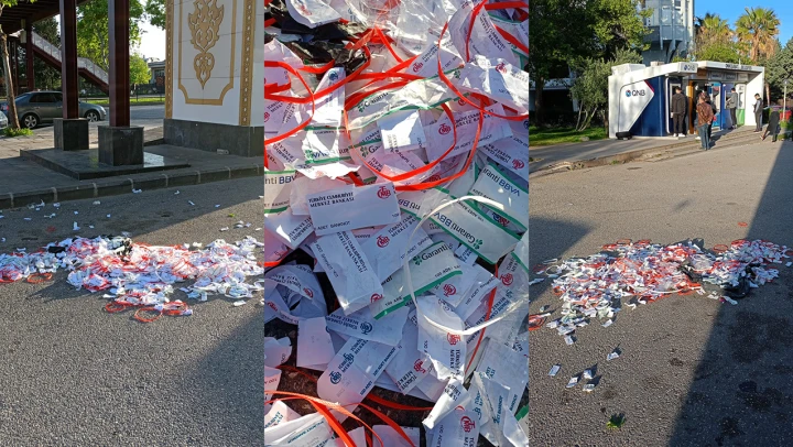 Kahramanmaraş'ın Onikişubat ilçesine bağlı Yunus Emre Mahallesi'nde bulunan Adnan Menderes Bulvarı üzerindeki banka ATM'lerinin yanına bırakılan para balyalarına ait kâğıt bantlar, çevre kirliliğine neden oldu.