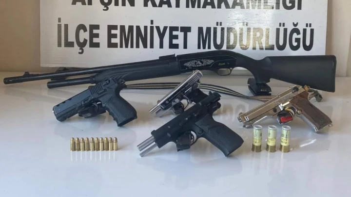 Adreslerde yapılan aramalarda 3 kurusıkı tabanca, 3 şarjör, 1 ruhsatsız tabanca, 1 av tüfeği ve 3 kartuş ele geçirildi.