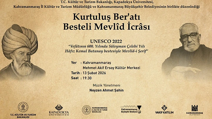 Kültür ve Turizm Bakanlığı, Kapadokya Üniversitesi ve İl Kültür Turizm Müdürlüğü ile birlikte Mehmet Akif Ersoy Kültür Merkezi'nde Kurtuluş Ber'atı Besteli Mevlid İcrası programına Kahramanmaraş ev sahipliği yapacak. 13 Şubat Cuma günü saat 19.30'da başlayacak programa tüm vatandaşlar davet edildi.