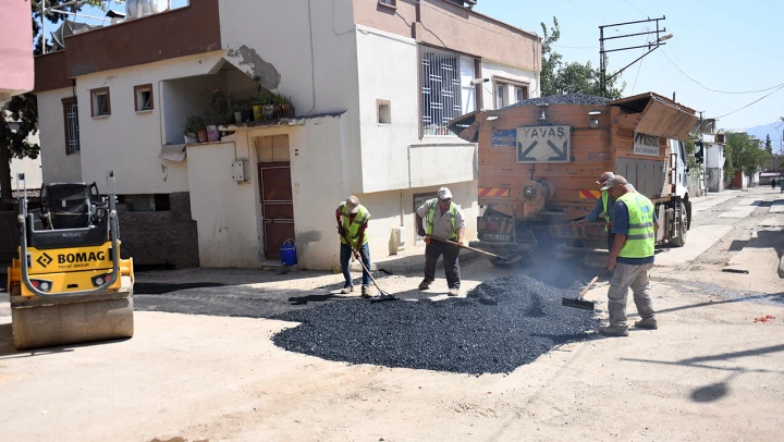 KASKİ, Dulkadiroğlu Namık Kemal Mahallesi'nde altyapı imalatları sırasında yol yüzeylerinde meydana gelen bozulmaları sıcak asfaltla kaplıyor.