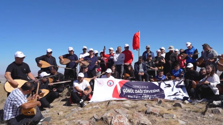 Yaklaşık 1 saatlik yürüyüşün ardından zirveye ulaşanlar, Türk bayrağının hemen yanı başında 40 sazı aynı anda çalarak Ertaş'ın 'Gönül Dağı' ile farklı türkülerini seslendirdi.