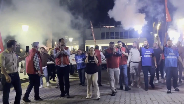 Meşale yakan, çeşitli sloganlar atan ve halay çeken işçiler, daha sonra 'Bu iş yerinde grev var' yazılı pankart açtı. Sendikaların şube başkanları ve işçiler, pankartı büyükşehir belediye binasına astı.