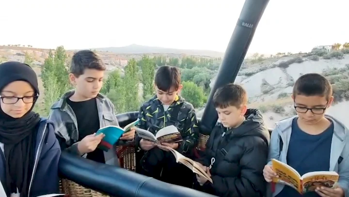 Nevşehir'de, öğretmen ve öğrenciler, farkındalık oluşturmak için sıcak hava balonuyla yükseldikleri gökyüzünde kitap okuma etkinliği düzenlendi.