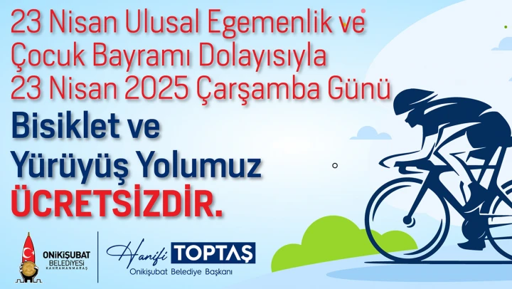 Onikişubat Belediyesi, 23 Nisan Ulusal Egemenlik ve Çocuk Bayramı dolayısıyla Kahramanmaraş'ta düzenleyeceği Çocuk Şenliği'ne ek olarak Bisiklet ve Yürüyüş Yolu'nu da bir günlüğüne ücretsiz hale getirdi.