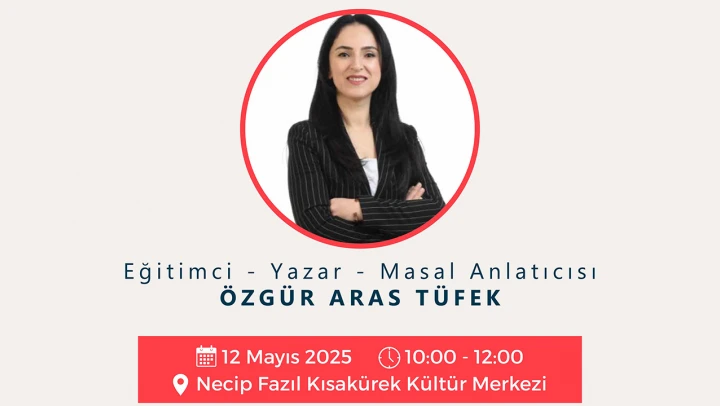 12 Mayıs 2025 Pazartesi günü 10 ile 12.00 saatleri arasında Necip Fazıl Kısakürek Kültür Merkezi'nde gerçekleştirilecek etkinliğin konuğu, eğitimci, yazar ve masal anlatıcısı Özgür Aras Tüfek olacak.