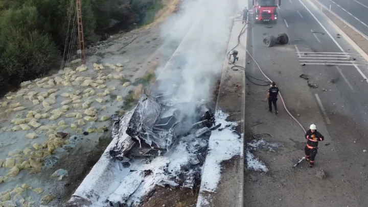 Freni arızalandığı belirtilen Salih Eken (45) yönetimindeki 41 AOU 373 plakalı tır, aynı yönde seyreden otobüse yandan çarptıktan sonra refüje çıktı. İstinat duvarına çarpan tırda yangın çıktı.