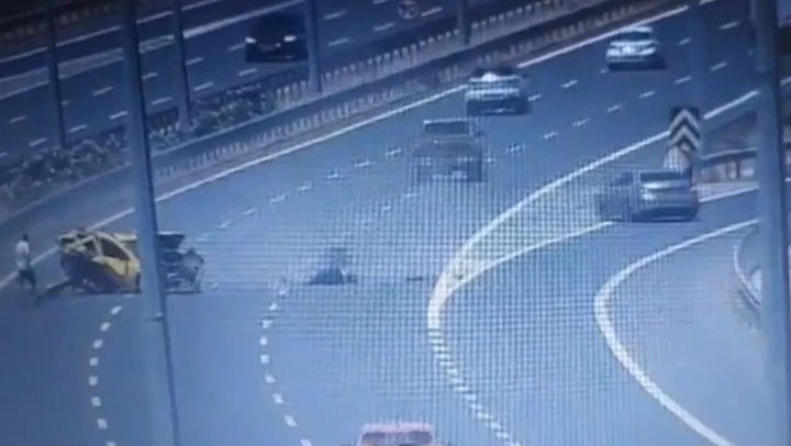 Kaza anı otoyoldaki güvenlik kameralarınca kaydedildi. Kayıtlarda, otoyolda seyreden taksinin önündeki araca çarpmasının ardından sol şeritte aracı durdurduğu görülüyor. Otomobilin de taksiye arkadan çarpması görüntülerde yer alıyor.