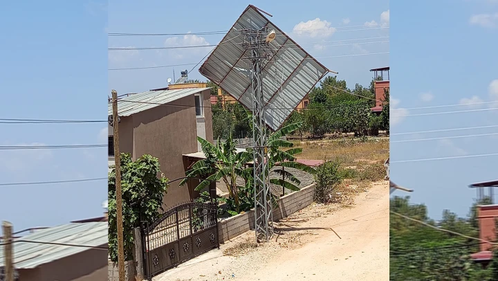 Adana'nın merkez Sarıçam ilçesinde, şiddetli rüzgar nedeniyle uçan trafonun çatısı elektrik direğinde asılı kaldı.