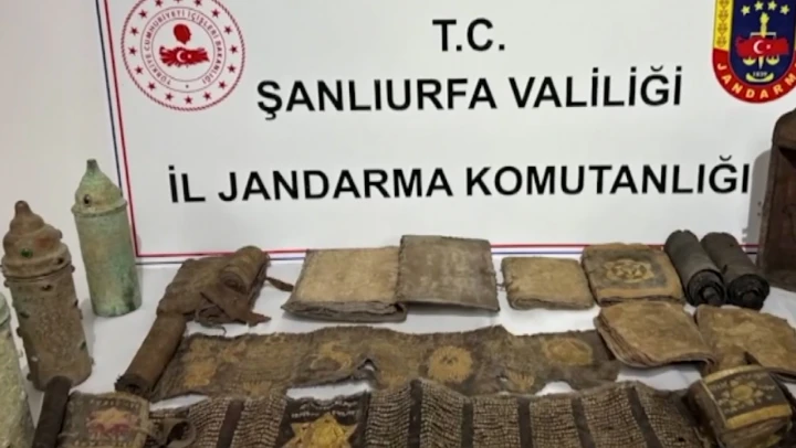 Şanlıurfa'nın Eyyübiye ilçesinde tarihi eser olduğu değerlendirilen 11 kitabe, 4 heykel, tablo ve 4 kitabe koruma kabı ele geçirildi, 2 şüpheli yakalandı.