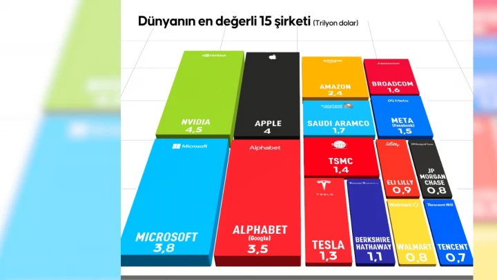 Listede ilk sırada 4,58 trilyon dolarla dünyanın önde gelen çip üreticisi Nvidia yer alırken onu 4 trilyon dolar ile iPhone'un sahibi Apple takip ediyor. Aynı zamanda IOS işletim sisteminin de sahibi olan Apple en büyük gelirlerinden birini App Store'dan elde ediyor. Şirket, kullanıcıların indirdikleri uygulama ve aboneliklerden ciddi miktarda gelir sağlıyor.