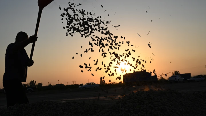 Traktörlerle toplanıp römorklara doldurulan ürünler, kuruması için güneş gören alanlara serildi.