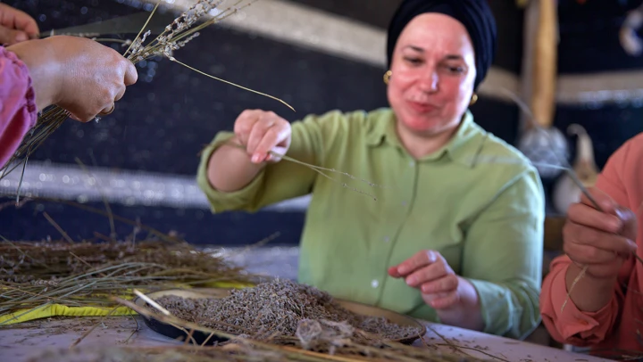 Bahçenin çapasından sulamasına ve lavantaların bakımına kadar her şeyiyle yakından ilgilenen kadınlar, burayı yeniden mor bir görünüme kavuşturdu. Kooperatif üyesi kadınlar, bahçeden topladıkları lavantadan da yağ, sabun ve mum gibi çeşitli ürünler elde ediyor.