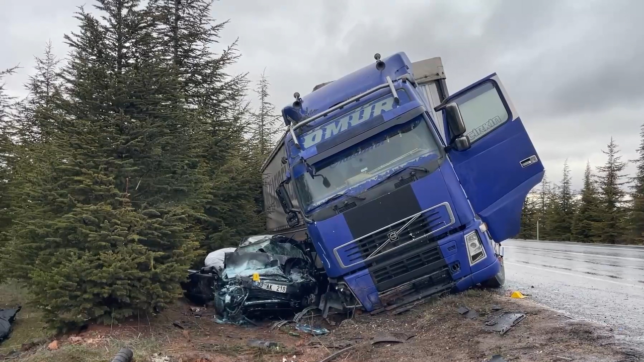Görüntüde, tırın karşı şeride geçtiği ve otomobille çarpışarak yoldan çıktığı yer alıyor.