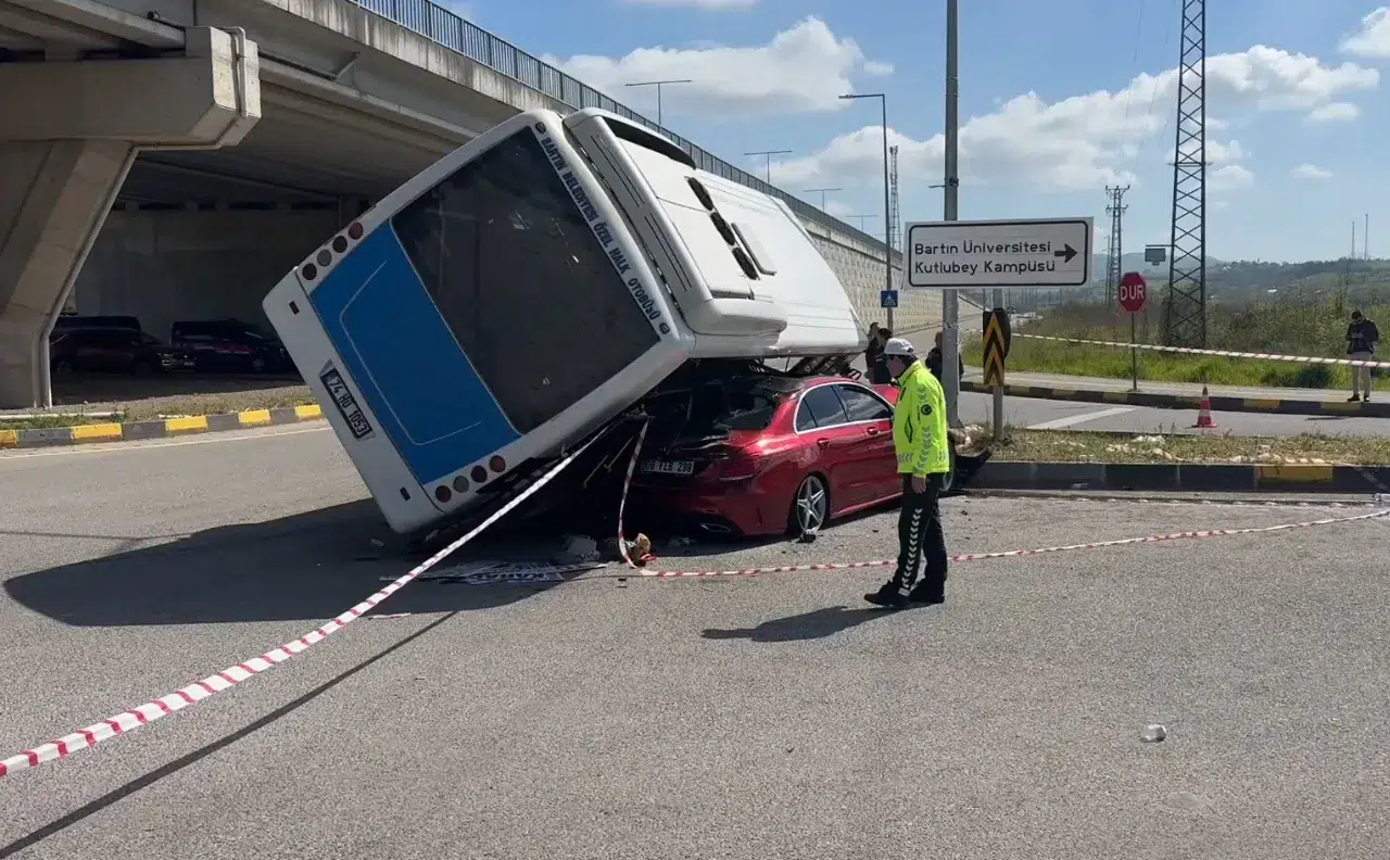 Kent merkezinden Bartın Üniversitesine öğrenci taşıyan H.K. yönetimindeki 74 HO 1053 özel halk otobüsü, Kutlubeyyazcılar kampüsü mevkisinde virajdan dönmek isterken kontrolden çıkıp İ.Ç. idaresindeki 06 FEB 298 plakalı otomobilin üzerine devrildi.
