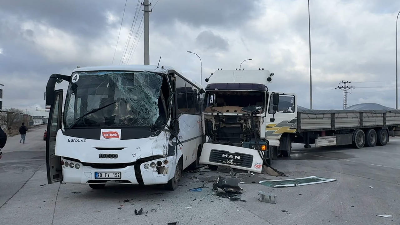 Organize Sanayi Bölgesi'ne işçi taşıyan M.Ç. idaresindeki 70 FV 192 plakalı midibüs, Karaman-Ereğli kara yolundaki kavşakta, H.A. yönetimindeki 03 SE 547 plakalı tırla çarpıştı.