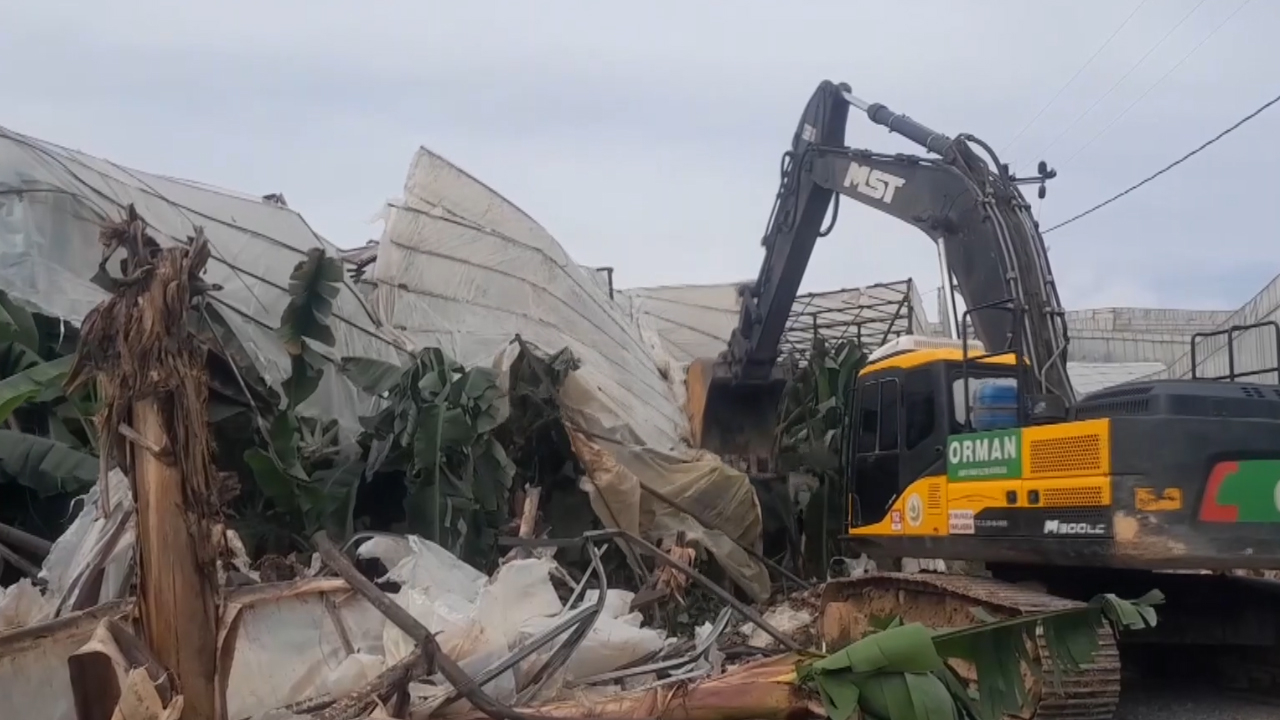 Ekipler, 34 bin 401 metrekarelik alana yayılan ev ve seraların yıkımına iş makineleriyle başladı.