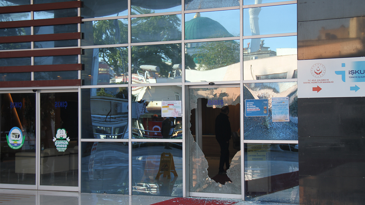 Olayda binanın giriş kapısı ve vezne bölümünün camları kırıldı.