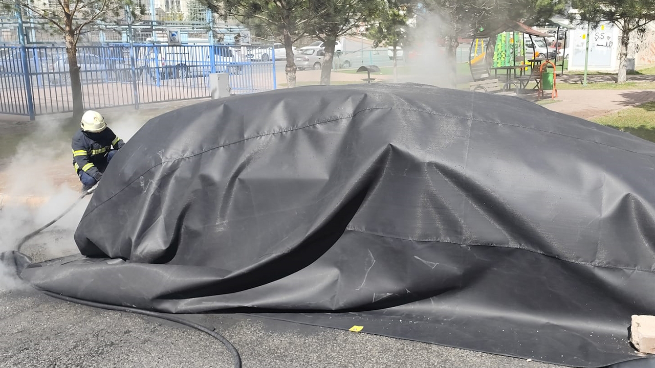Ekipler, araç yangınları için özel üretilen, "perde" adı verilen malzemeyle otomobilin üzerini tamamen kapatarak yangını söndürdü.