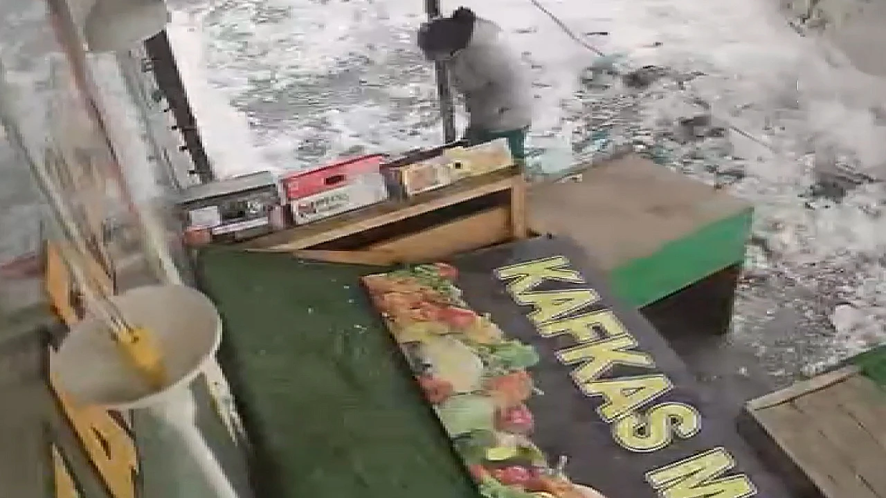 Çocuğun kar ve buz kütlesinin altında kalmaktan son anda kurtulduğu anlar, bir iş yerinin güvenlik kamerasınca kaydedildi.