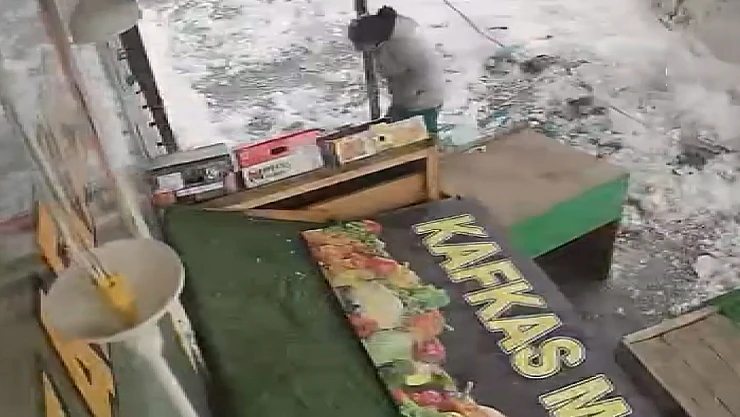 Kars'ta bir çocuğun 5 katlı apartmanın çatısından düşen kar ve buz kütlesinin altında kalmaktan son anda kurtulması, güvenlik kamerasına yansıdı.