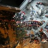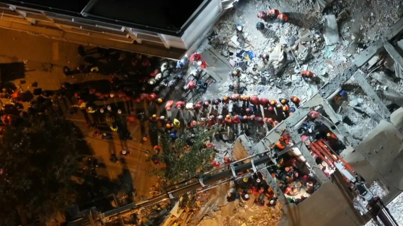 Yüzlerce kişiden oluşan arama kurtarma ekipleri, alandaki molozları kovalarla çıkarırken, beton bloklar vinç desteğiyle askıya alındı.