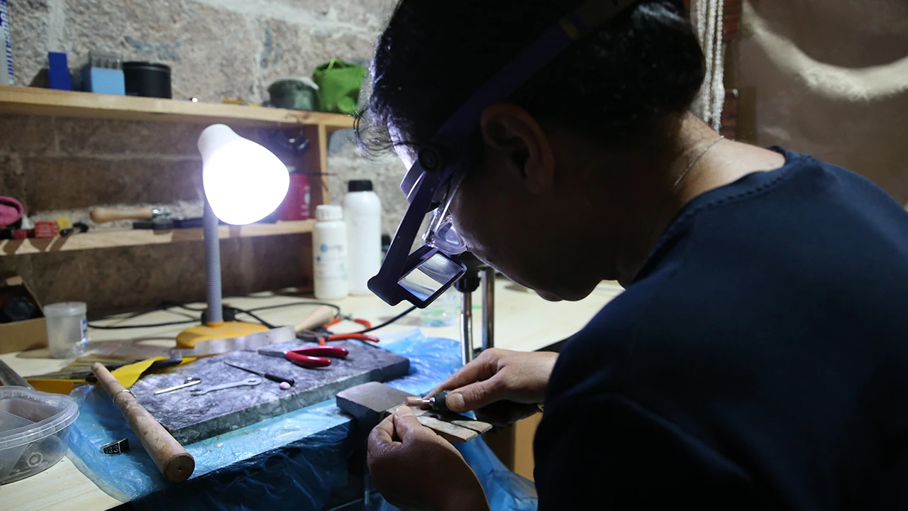 Erzincan ve Kahramanmaraş depremlerinde yakınlarını kaybeden 51 yaşındaki zanaatkar Seval İncirbölen, Hatay'daki tarihi Sokullu Mehmet Paşa Külliyesi'nde açtığı atölyede el emeğiyle takı tasarlıyor.