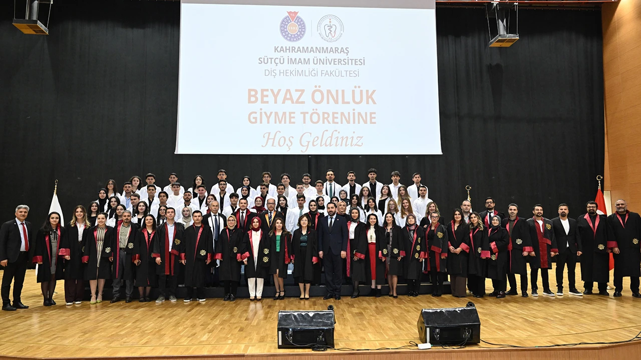 Kahramanmaraş Sütçü İmam Üniversitesi (KSÜ) Yunus Emre Kongre ve Kültür Merkezi, geleceğin diş hekimlerini ağırladı. Rektör Vekili Prof. Dr. Orhan Doğan, Rektör Yardımcıları Prof. Dr. Nuri Kahveci ve Prof. Dr. Hafize Öksüz, Ağız ve Diş Sağlığı Uygulama ve Araştırma Merkezi Başhekimi Prof. Dr. Hakan Kamalak, Kahramanmaraş Diş Hekimleri Odası Başkanı Sefer Mahmutoğlu, akademisyenler, öğrenciler ve aileleri törende hazır bulundu.