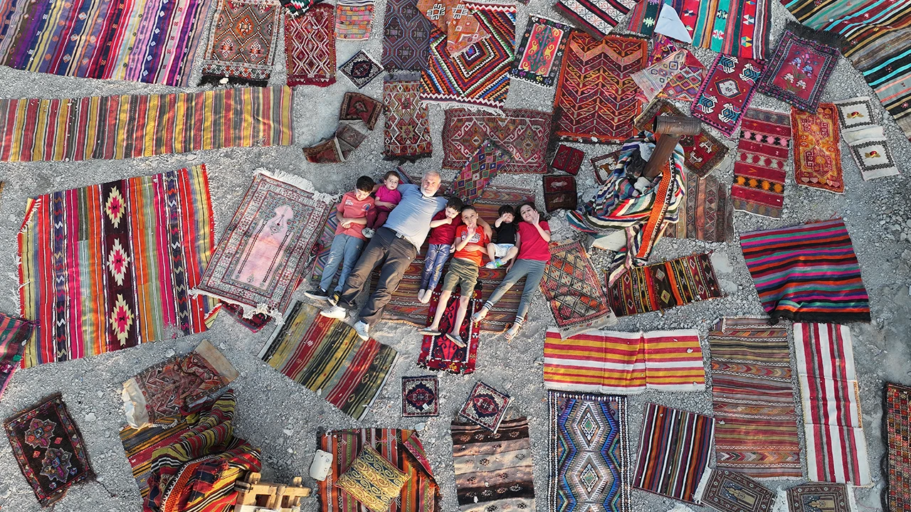 Dokuma halı ve kilimlerden oluşan koleksiyonunu evinin çatısında sergiliyor