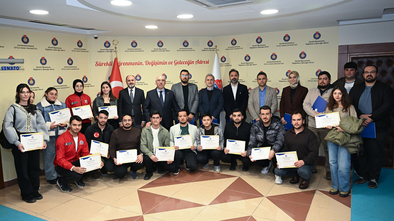 Mühendislik ve Mimarlık Fakültesi Dekanı Mehmet Ünsal başta olmak üzere projede aktif rol üstlenen öğretim elemanları ve öğrenciler, Kahramanmaraş Sütçü İmam Üniversitesi Rektörü Mahmut Ak tarafından belgelerini aldı.