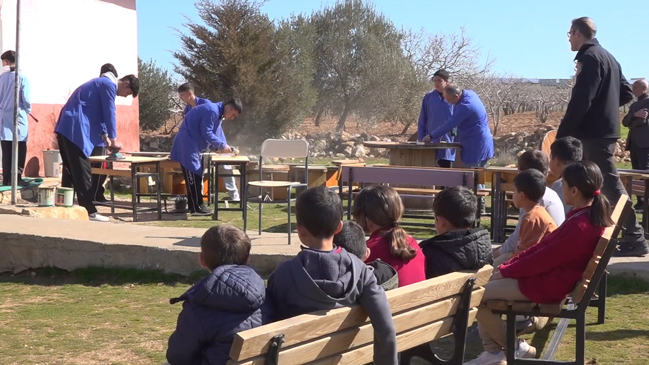 Öğrenciler ayrıca eski kablo makaralarından oturak yaparak hem atık ve geri dönüştürülebilir malzemeleri değerlendiriyor hem de yeni sosyal alanlar oluşturuyor.