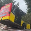 El freni çekilmeyen otobüs istinat duvarını yıkıp asılı kaldı