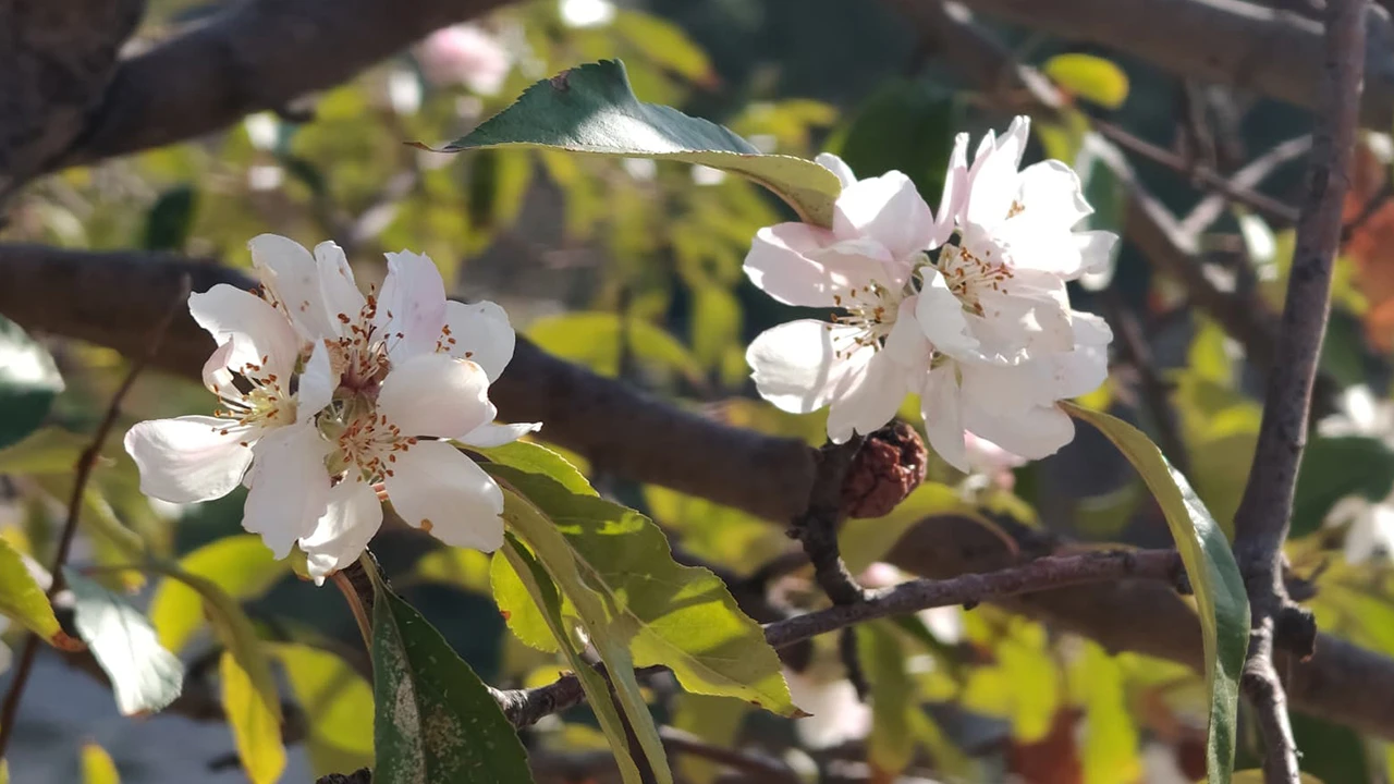 Sonbaharda hava sıcaklıklarının mevsim normallerinin üzerinde seyretmesiyle Alaattin Mahallesi'nde beton bir duvarın yanında yetişen elma ağacında çiçek açtığı gözlendi.