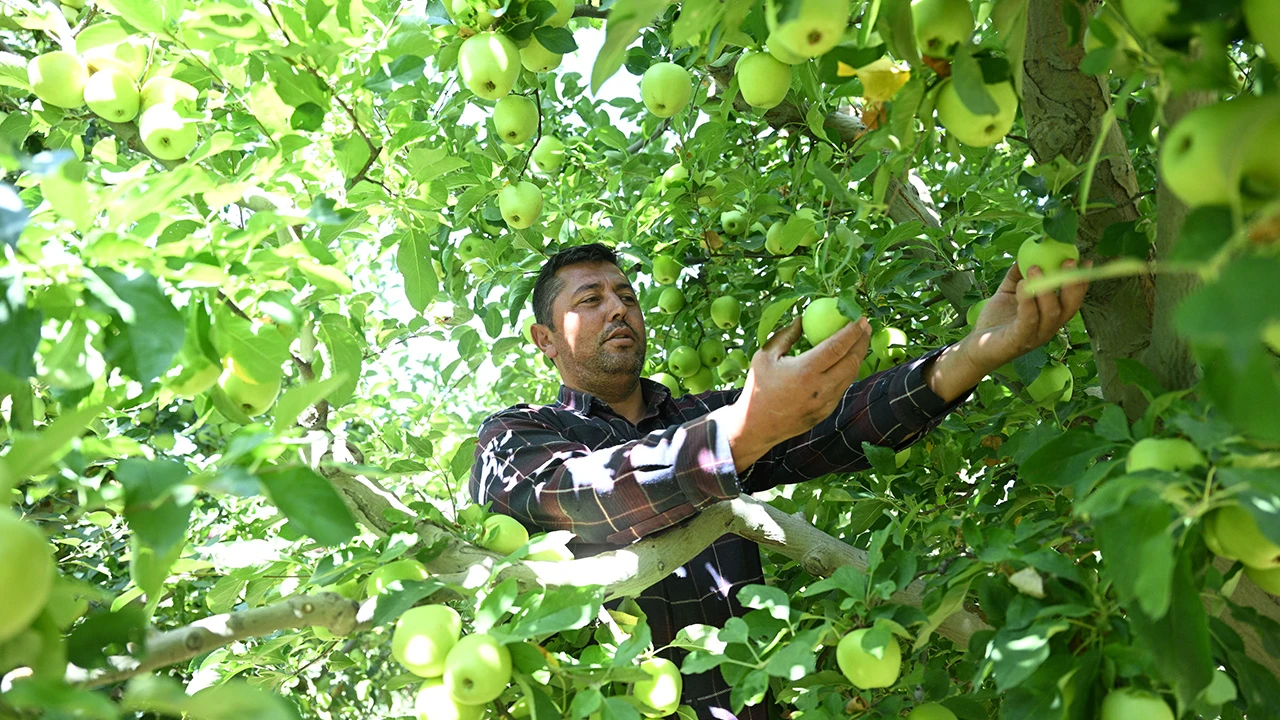 Türkiye'nin önemli elma üretim merkezlerinden Kayseri'de nisan ayında yaşanan zirai dona karşı spring su uygulamasını kullanan bir çiftçi, büyük oranda korumayı başardığı elmalarını hasat etmeye başladı.
